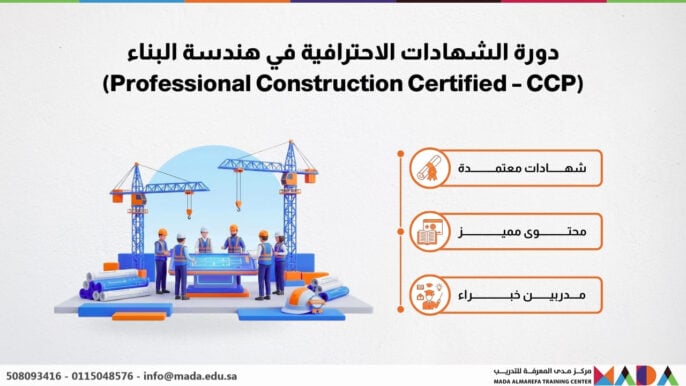 تُعتبر دورة الشهادات الاحترافية في هندسة البناء (Professional Construction Certified – CCP) فرصة مميزة للمهندسين والفنيين وأصحاب القرار في قطاع الإنشاءات للارتقاء بمهاراتهم المهنية. توفر هذه الدورة التدريبية أحدث المعارف النظرية المرتبطة بإدارة مشاريع البناء وتخطيطها وتنفيذها، مما يعزز فرص المشاركين في سوق العمل التنافسي. احرص على تعلم دورة الشهادات الاحترافية في هندسة البناء (Professional Construction Certified – CCP) من خلال مركز مدى المعرفة للتدريب لتكون مؤهلًا للعمل في أفضل الشركات الهندسية.