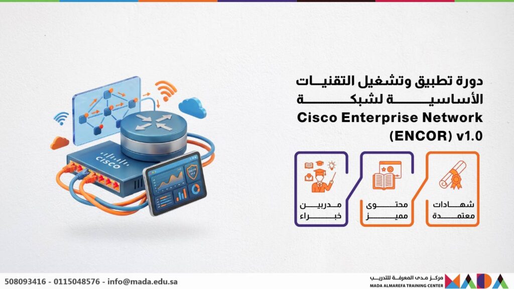 تُعد دورة تطبيق وتشغيل التقنيات الأساسية لشبكة Cisco Enterprise Network (ENCOR) v1.0 من أبرز البرامج التدريبية المتخصصة التي تهدف إلى تمكين المتدربين من امتلاك فهم نظري متين لمفاهيم وأساليب تشغيل وصيانة الشبكات المؤسسية باستخدام منصات سيسكو (Cisco). تم تصميم هذه الدورة لتوفير معرفة شاملة حول البنية التحتية للشبكات في المؤسسات الحديثة، مع التركيز على الجانب النظري دون الحاجة إلى تطبيقات عملية أو تمارين ميدانية. تُغطي دورة تطبيق وتشغيل التقنيات الأساسية لشبكة Cisco Enterprise Network (ENCOR) v1.0 الجوانب الأساسية مثل بروتوكولات التوجيه (Routing)، التبديل (Switching)، الأمن، والأتمتة، إلى جانب شرح مفاهيم الحوسبة السحابية، وإدارة الشبكة عن بعد، ودمج التقنيات الحديثة مثل SD-Access وDNA Center. يُقدّم المحتوى بأسلوب منهجي وواضح يُسهم في بناء وعي تقني حول كيفية بناء شبكات مؤسسية قوية، قابلة للتوسع، وآمنة، مما يجعلها مناسبة للمهندسين، التقنيين، ومدراء الشبكات في المؤسسات الحكومية والخاصة.