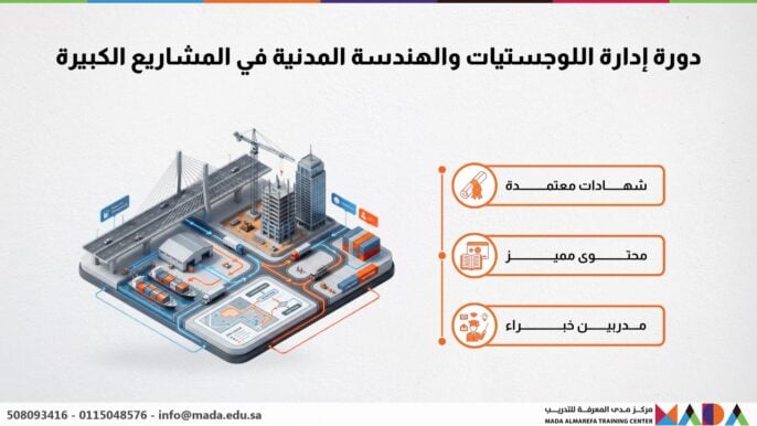 تُعد “دورة إدارة اللوجستيات والهندسة المدنية في المشاريع الكبيرة” فرصة مميزة لرفع كفاءة المهنيين في مجالات إدارة المشاريع الكبرى، حيث تقدم محتوى عملي يربط بين نظريات الهندسة المدنية وتطبيقات إدارة سلاسل الإمداد. تُنفَّذ هذه الدورة من قِبل مركز مدى المعرفة للتدريب – لتلبية احتياجات السوق السعودي السريع النمو، خاصةً مع التوسع الكبير في المشاريع البنية التحتية الكبرى مثل مشروعات القدية ومشاريع رؤية 2030.