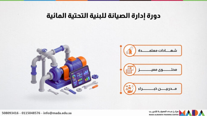 تُعد “دورة إدارة الصيانة للبنية التحتية المائية” من الدورات المتخصصة التي تهدف إلى إكساب المشارك المهارات اللازمة لإدارة وصيانة المرافق والمعدات المتعلقة بالبنية التحتية المائية. ترتبط هذه الدورة ارتباطًا مباشرًا باحتياجات سوق العمل في قطاعات المياه والصرف الصحي والطاقة. من خلال تعلم دورة إدارة الصيانة للبنية التحتية المائية، يحصل المتدرب على فهم عميق لأساليب الصيانة الحديثة وتطبيقاتها الفعلية.